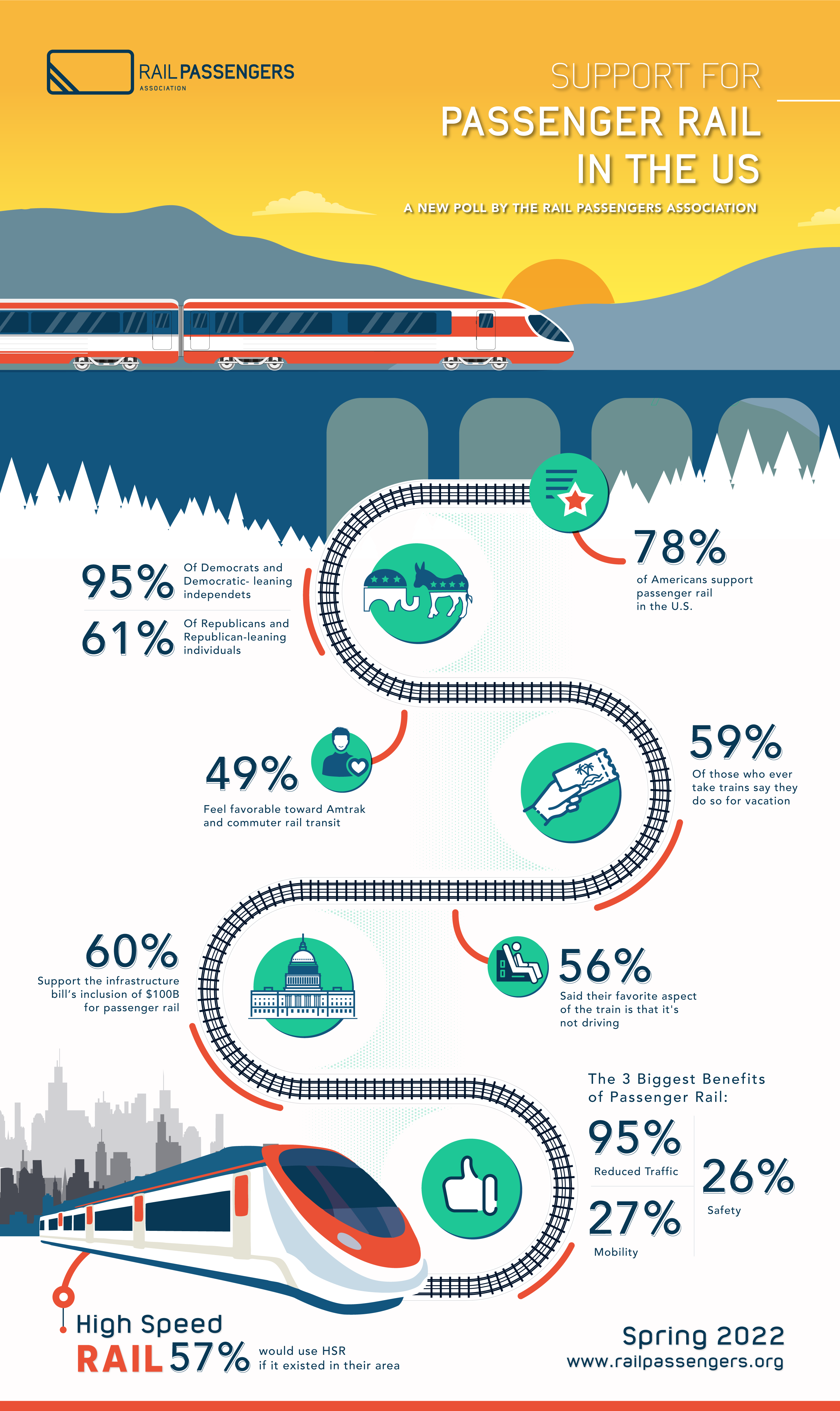 The Rail Passengers Association conducted a nation-wide poll showing strong bi-partisan support for passenger rail spending with two-thirds supporting a full national rail plan (we should get on the map!); a recognition to include equitable rail policy and passenger rail in particular as one part of an interconnected, interdependent and holistic transportation network. 66% of respondents said they support adding more routes to the current rail network.